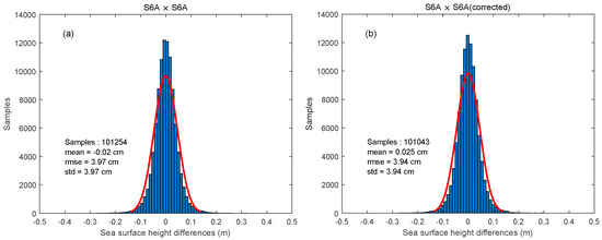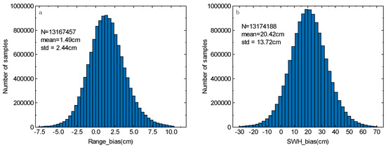 The mean and STD of the SSH crossover differences are computed. To mitigate the effect of sea ice, only data within 50° of the Equator were used. The duration for the crossover variations in this study was set to 3 days. Figure 25 shows the histogram of the distribution of the SSH crossover differences before and after correction, respectively. The mean and STD of the HRM SSH differences at crossovers have no significant changes before (mean: −0.02 cm, STD: 3.97 cm) and after (mean: −0.025 cm, STD: 3.94 cm) correction. Therefore, the application of range correction does not change the accuracy of the HRM SSH measurements.