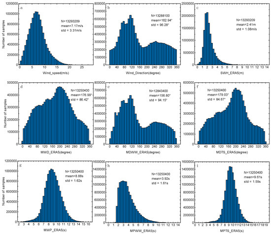 Figure 2. Density of data distribution of (a) wind speed, (b) wind direction, (c) ERA5 SWH, (d) ERA5 MWD, (e) ERA5 MDWW, (f) ERA5 MDTS, (g) ERA5 MWP, (h) ERA5 MPWW and (i) ERA5 MPTS.