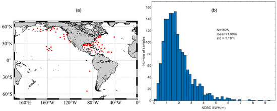Figure 3. (a) Locations and (b) data distribution of the NDBC buoys used in this study.