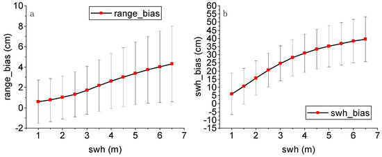 Figure 4. Biases of (a) range and (b) SWH between Sentinel-6 HRM and LRM against SWH values (error bars indicate standard deviation—this is the same for all subsequent figures).