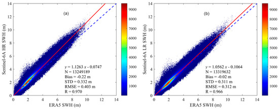 Figure 4 shows the trend plot of range and SWH (obtained from Sentinel-6) bias as a function of SWH (obtained from ERA5), and it can be seen that the larger the SWH, the larger its bias. Figure 5 shows the SWH of LRM and HRM compared with the ERA5 model.