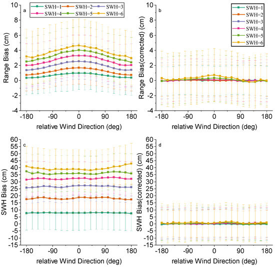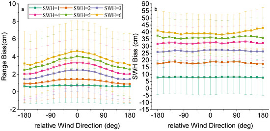 Combining the results of the analyses in Figure 6, we can conclude that the relative wind direction has an influence on both range bias and SWH bias, but the degree of influence and the trend are different.