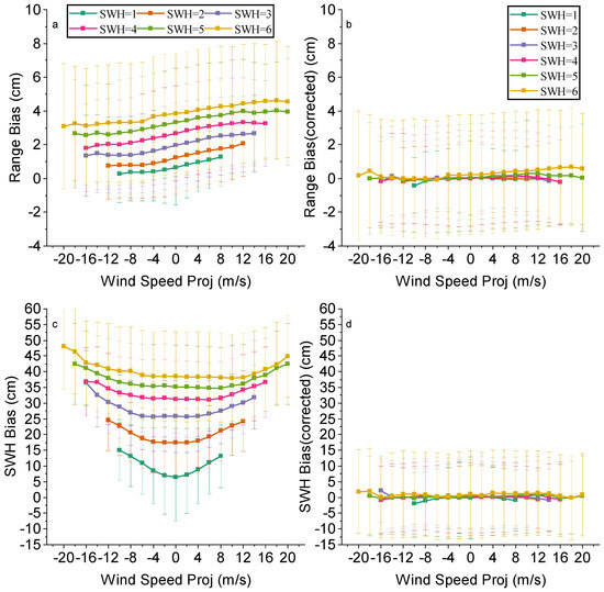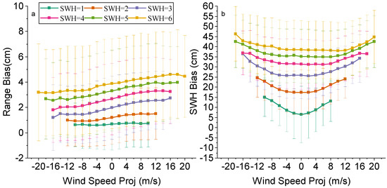 Figure 7 shows the impact of wind speed projection on range bias and SWH bias. It can be observed that the range bias and SWH bias vary significantly with the wind speed projection. This is related to the degree to which the relative wind direction’s influence on the range bias and SWH bias is significant. According to the formula of wind speed projection (Equation (4)), it can be analyzed that the effect of wind speed projection on the range bias is affected by both the relative wind direction and the magnitude of wind speed. However, for the SWH bias, the wind speed projection is mainly determined by the wind speed magnitude, and the relative wind direction has less influence, so it will show an approximate curve symmetric of about 0 m/s.