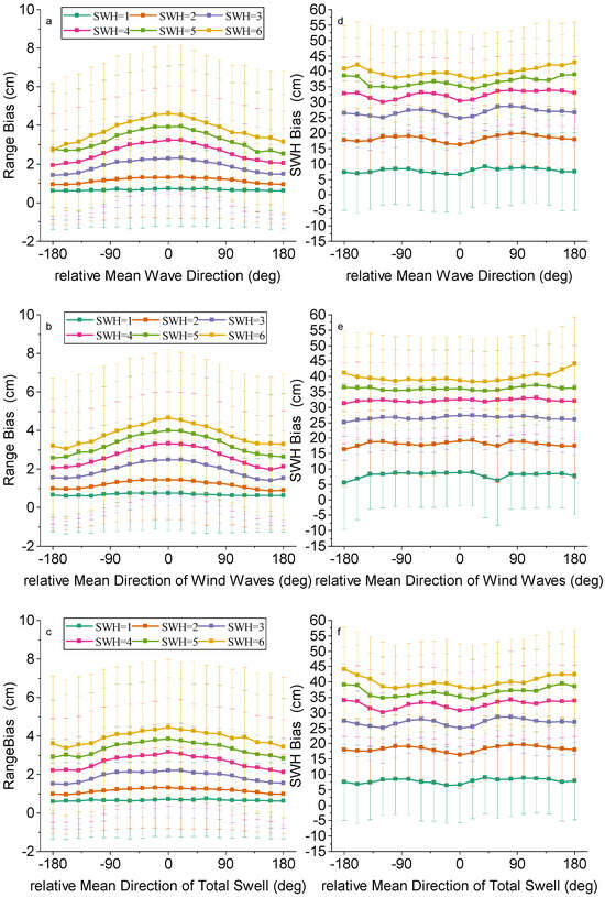 Figure 8 shows the impact of relative MWD, relative MDWW, and relative MDTS on range bias and SWH bias. The relative MWD, MDWW, and MDTS are obtained by the same calculation method as the relative wind direction. Also, the effects of these relative directions on the range bias and SWH bias follow the same trend as that of the relative wind direction on them. As shown in Figure 8a–c, the range bias is symmetric about 0° and the wave peaks at 0°, with a decreasing trend to both sides. As shown in Figure 8d–f, the effects of relative wave direction and relative swell direction on SWH bias show opposite trends, but both are symmetric about 0°, with a less pronounced and flatter trend to either side.