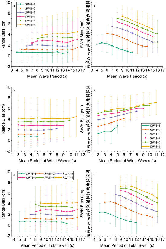 Figure 9 shows the impact of MWP, MPWW, and MPTS on range bias and SWH bias. As shown in Figure 9a–c, for the range bias, the trend of the bias change is not obvious with the increase in the three wave periods. Especially for wind waves, it is almost a straight line. From Figure 9d–f they show that the trend of SWH bias is significantly more drastic than that of range bias. With the increase in the MWP and MPTS, the SWH bias shows a significant decreasing trend, and the range reaches 15 cm. Whereas with the increase in the MPWW, the SWH bias shows an increasing trend than that on range and increases from 32 cm to 42 cm at SWH = 6 m.