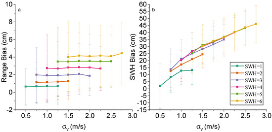 Figure 10b illustrates the trend of SWH bias with σ v . As with the range bias, the SWH bias increases as the SWH value increases. However, unlike the range bias, the SWH bias varies more significantly with σ v . It increases with the increase in σ v , and the increase reaches about 20 cm at SWH = 6 m.