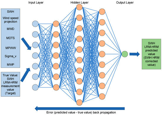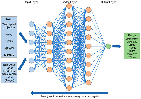 Figure 11 illustrates the network diagram for the range training model, whereas Figure 12 depicts the network diagram for the SWH training model. Based on the results of the above impact analysis, wind speed projection contains information about the relative wind direction, so we can select the wind speed projection as input for neural network. Furthermore, we find that the trends are approximately consistent in their relative direction, so here we can select relative MWD, and relative MDTS as a representation. Again, in the period section, it is enough to select only one parameter as a representative for the trend similarities, so we select MPWW as an input. At the same time, we can find that the impact of MPWW on SWH bias compared to range has a different trend from that of MWP and MPTS, so in the SWH model, we add MWP as an input again. And according to the previous analysis, σ v can also be found that it has an impact on both the range bias and SWH bias, so it can also be used as an input parameter. In conclusion, we select SWH, wind speed projection, relative MWD, relative MDTS, MPWW and σ v as inputs to the range neural network and SWH, wind speed projection, relative MWD, relative MDTS, MWP, MPWW and σ v as inputs to the SWH neural network. The networks have a single input layer, several hidden layers, and a single output layer. After extensive experimentation, three concealed layers were established, comprising 6 or 7 (6 for range model, 7 for SWH model) neurons in the first layer, 10 neurons in the second layer, and 9 neurons in the third layer. And we obtain range and SWH corrections at the output layer.