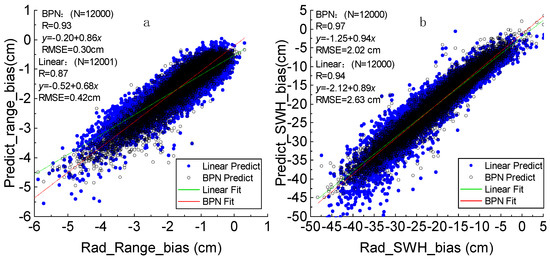 Figure 13. Comparison of BPNN and linear fitting effects for (a) range bias and (b) SWH bias. (Rad_Range_bias and Rad_SWH_bias mean the radar measurements, Predict_Range_bias and Predict_SWH_bias mean the predict value).