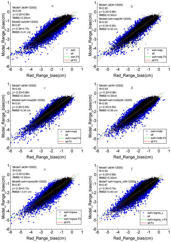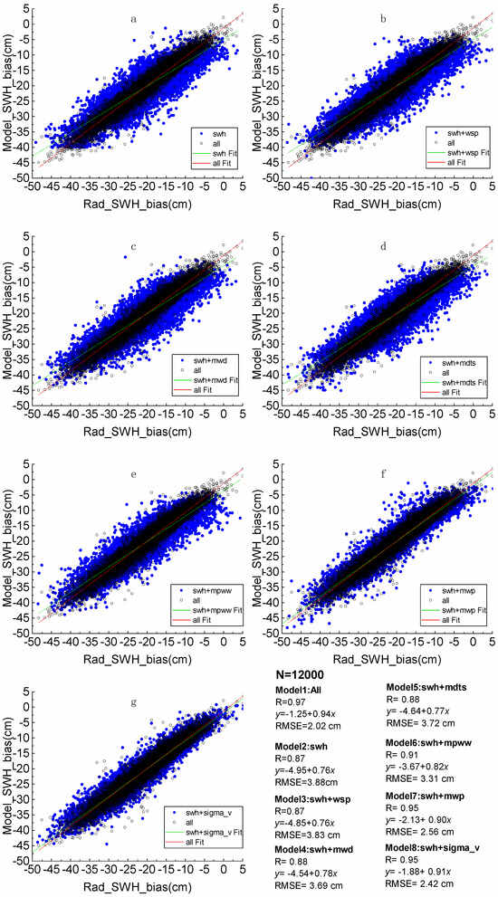 Figure 14 and Figure 15 are comparisons of the effects of the BPNN correction models with different input parameters. Figure 14 is a comparison of the correction models for range bias. The seven models are, Model 1 is the correction model with all input parameters used in this experiment (i.e., shown in Figure 11), which serves as a control group for the five plots; Model 2 is the correction model with only SWH as an input parameter; Model 3 is the correction model with SWH and WSP as input parameters; Model 4 is the correction model with SWH and relative MWD as input parameters; Model 5 is the correction model with SWH and MDTS as input parameters; Model 6 is the correction model with SWH and MPWW as input parameters; and Model 7 is the correction model with SWH and σ v as input parameters. Similarly, Figure 15 is a comparison of correction models for SWH bias, and according to Figure 12, there is one more SWH bias correction input parameter than range, so in addition to the seven models mentioned earlier, there is an additional Model 8 with SWH and MWP as input parameters.