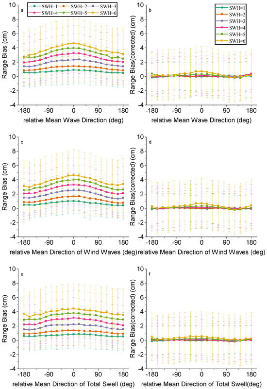 Figure 8. Biases of (left) range and (right) SWH between Sentinel-6 HRM and LRM against (a,d) relative mean wave directions, (b,e) relative mean direction of wind waves and (c,f) relative mean direction of total swell for different SWH values.