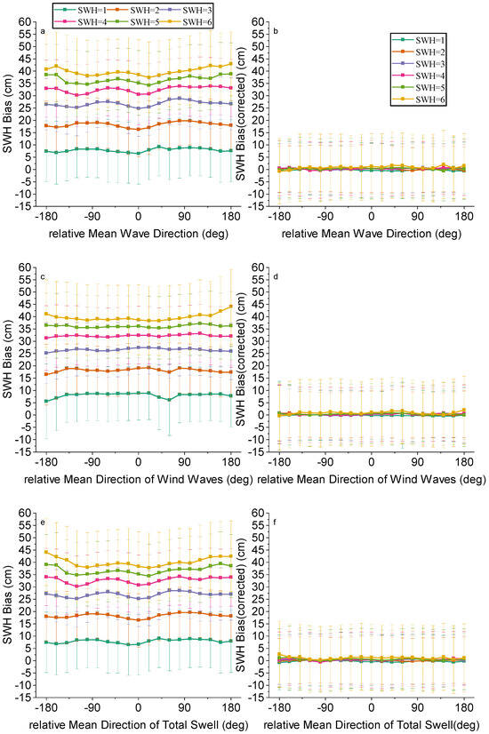 Figure 19. Biases of SWH between Sentinel-6 HRM and LRM against (a,b) relative mean wave directions, (c,d) relative mean direction of wind waves and (e,f) relative mean direction of total swell for different SWH values before (left) and after (right) correction.