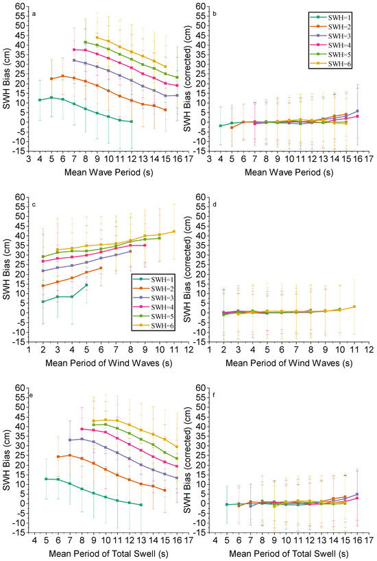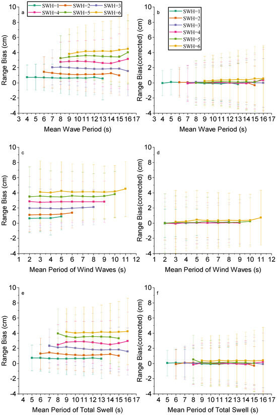 Figure 20. Biases of range between Sentinel-6 HRM and LRM against (a,b) mean wave period, (c,d) period of wind waves and (e,f) mean period of total swell for different SWH values before (left) and after (right) correction.