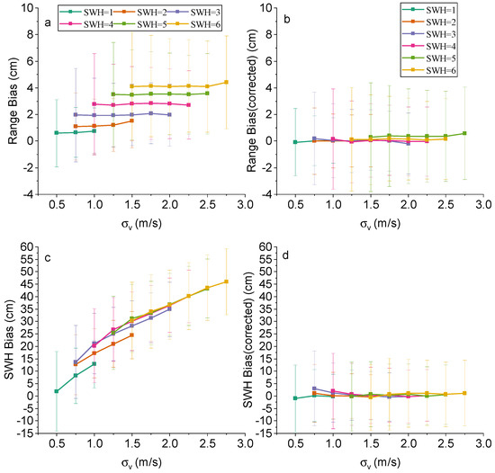 Figure 22. Biases of (a,b) range and (c,d) SWH between Sentinel-6 HRM and LRM against σ v for different SWH values before (left) and after (right) correction.