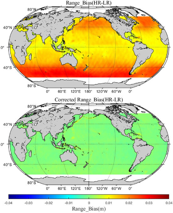 Figure 23 shows the global average distribution of range biases between HRM and LRM before and after correction. In the upper and lower plots, we can observe the impact of different geographic locations and the global effect of the correction. The before-correction bias is in the range of −0.04 m to 0.04 m, and the after-correction bias is concentrated near 0 m, i.e., a large area that shows a green color. This indicates that the correction effect is significant and no obvious range inconsistencies exist between HRM and LRM, which may provide better measurements for global and regional sea level rise studies.