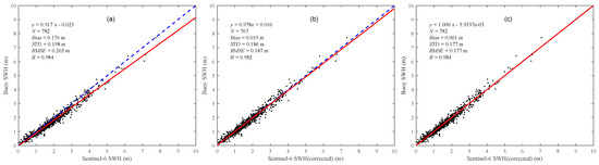 Figure 26. Scatterplots of SWH measurements against the collocated NDBC buoys (a) before correction, (b) after model correction and (c) after linear correction.