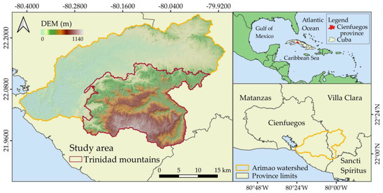 Study area location: Trinidad Mountains within the Arimao watershed, south–central region of Cuba.