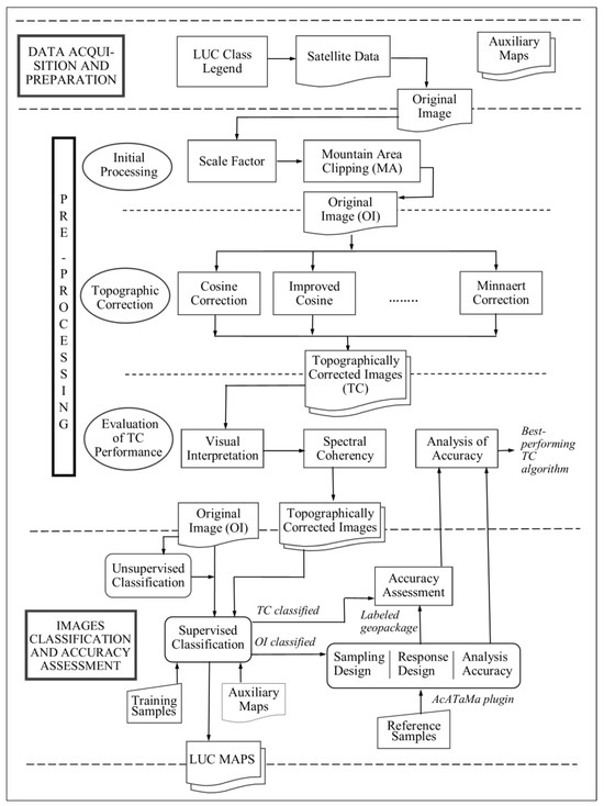 The main difficulty in determining the LUC in mountainous regions is related to topographic correction, as there is no consensus on methods that can be universally applied to any geographical area. Without topographic correction, satellite images of mountainous regions can lead to a significant LUC misclassification [22]. Over the last decades, many authors have compared topographic methods applied to Landsat images [11,13,18,23,24,25,26,27]. However, these evaluations generally focus on eliminating or reducing the topographic effect and do not assess its impact on classification accuracy [28]. Nonetheless, the negative impact of this effect on classification accuracy has been demonstrated in several studies [22,29,30,31].