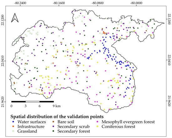 The thematic accuracy of the classifications was evaluated using version 23.4 of the Accuracy Assessment of Thematic Maps (AcATaMa) plugin for QGIS, designed for validating single LUC maps [80]. Based on the methodologies of [71], it has shown strong performance in studies by various authors [81,82,83,84]. AcATaMa was applied to the classified original image. For the sampling design component, the stratified random sampling method was employed, with fixed values assigned to each category. A total of 475 samples were manually allocated according to the Alloc4 scheme. AcATaMa generated a geopackage containing random points, stratified by classes, which were verified to avoid overlap with those used in the classification. The spatial distribution of the points is shown in Figure 3.