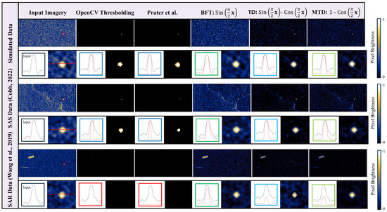 Qualitative Comparison: Figure 2 highlights how the BFT, TD, and the MTD filters perform tone mapping to visually enhance bright features when applied on normalized amplitude simulated, SAS, and SAR data described by Equation (1) with a single bright scatterer located in the images specified by the red circle. Line intensity profiles of cross-sectional cuts across the simulated scatterer are used to illustrate how the shape and structure of the scatterer change with each method.
