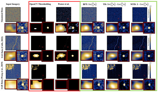 Significant Features of Methods: The BFT method applied in Equation (1) as stands out from all the other methods at minimizing the distortion and preserving the general shape of the scatterer, as shown in the green boxes. The TD and MTD excel at reducing the noise that was captured in the BFT imagery and highlighting only pixels pertaining to the scatter. However, the trade-off is that these methods slightly distort the structure by clipping the low-intensity pixels of the scatterer to zero, as shown in the light blue and green boxes. The OpenCV thresholding method and Prater et al. [2] statistical method clip significant low-intensity pixels that define the overall shape of the scatterer, as shown in the dark blue boxes for the SAS data, and failed to capture the bright scatterer in the SAR imagery due to a nearby bright target being presented in the imagery. These results show that the threshoding methods are specifically designed for detecting bright scatterers in synthetic aperture imagery when there are no other bright feature in the scene and are not applicable for detecting targets with higher intensity than the scatterer, as opposed to the BFT, TD, MTD methods that detect the target and the scatterer.