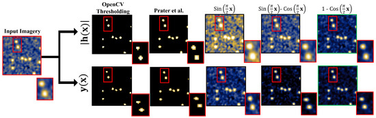 Further, in this paper, we are not only concerned with visually identifying and analyzing prominent scatterers in the synthetic aperture imagery saturated with speckle noise but also interested in applying in a bright scatterer detection pipeline to localize the scatterers. The BFT (Equation (5)), TD (Equation (8)), and MTD (Equation (9)) can be applied at the segmentation stage before generating binary masks in the pipeline to enhance the downstream localization and classification tasks. Implementing the BFT task would effectively select the bright features and implementing the TD and MTD would effectively reduce the intensity of the visual noise in a way to highlight the prominent scatterer. This is performed by converting to a binary representation of the function,