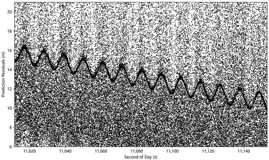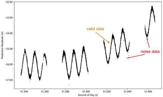 To investigate the effect of data preprocessing in the case of a low signal-to-noise (S/N) ratio, we selected the Topex (22076) measured data on 28 April 2016 at 6:00 UTC as the experimental sample. As shown in Figure 9, the prediction residuals of these data exhibit the characteristics of a low S/N ratio, with the valid data vaguely discernible and strongly disturbed by noise.