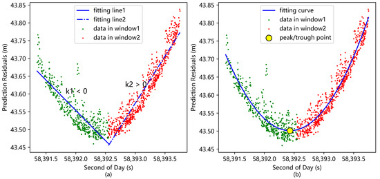 Identification of peak or trough point in the prediction residual data. (a) Rough determination of the region of the data peak or trough point; (b) Precise estimation of the position of the data peak or trough point.