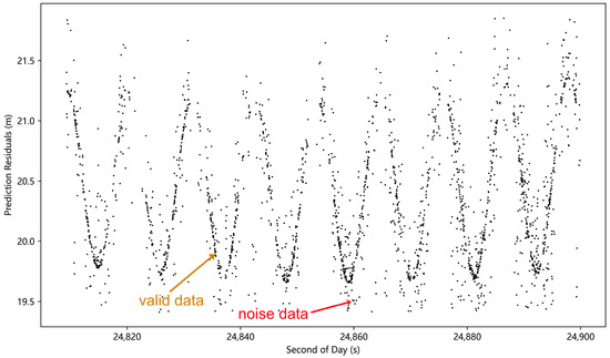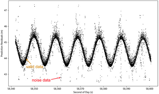 For the data preprocessing of conventional space targets, it is common to use manual noise rejection or automatic data identification techniques (e.g., Graz station’s fast identification algorithm, Poisson filtering, etc.) to realize the initial coarse filtering of data [38,39,40,41], and this coarse filtering means can effectively remove the noise away from the effective data band, but as shown in Figure 2, there still exists the residual noise near the effective data band. In this case, the traditional practice is to use polynomial fitting filtering for the fine rejection of noise [41,42,43]; this method is effective in dealing with laser ranging data for space targets with simpler motion states, less data volume, or less stringent requirements on data details. However, with the increase of the repetition rate of the laser ranging system and the increase of the information carried in the observation data, the researchers pay more attention to the subtle change patterns of the data in order to excavate the latent information in the data and use this information to carry out more in-depth scientific research. The ability of the polynomial fitting method to extract the patterns of data variation depends on its number; theoretically, the higher the number, the stronger the ability, but too high of a number will lead to data overfitting, so the number of polynomials will not be too high. In this case, when confronted with complex oscillatory patterns in prediction residuals, its limitations become evident as it cannot fully express the data’s variation patterns and is prone to mistakenly removing valid data during the noise reduction process, thus damaging the original data patterns. For such data, more targeted processing methods are needed.