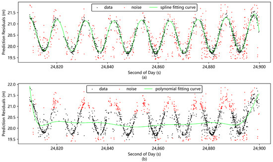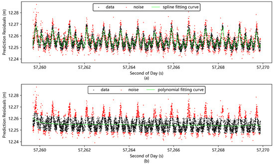 Figure 8 demonstrates the preprocessing results of the prediction residuals for the same set of laser ranging data using two different preprocessing methods. From the figure, it can be observed that the trend function obtained by the novel spline fitting method coincides with the variation trend of the data, successfully filtering out the residual noise away from the data band while retaining the original pattern of the data. In contrast, the trend function calculated by the polynomial fitting method does not match the variation trend of the data, and there is still a large amount of residual noise after the preprocessing, and some of the valid data with peaks and troughs are mistakenly deleted. The data in Table 1 also show that the RMS value of the novel spline fitting method after noise removal is one-fourth of that before noise removal and only one-seventh of that after noise removal of the polynomial fitting method, and the data accuracy is significantly improved. Through the above analysis and comparison, the preprocessing effect of the novel spline fitting method is significantly better than that of the polynomial fitting method when dealing with data with good characteristics.