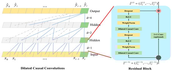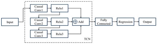Temporal Convolutional Networks (TCNs) is a deep learning model specifically designed for time series analysis, capable of efficiently capturing long-term dependencies and multi-scale temporal features []. Compared to traditional Convolutional Neural Networks [] (CNNs), Long Short-Term Memory (LSTM) networks, and Gated Recurrent Units [] (GRUs), the TCN model features a lightweight structure and can flexibly control the receptive field by adjusting the size of the convolutional kernels, making it particularly suitable for time series prediction tasks [,]. The model framework is as shown in Figure 1.