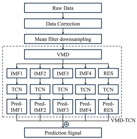 By employing a componentized modeling strategy, the proposed VMD-TCN model is capable of precisely predicting the vibrational state of construction scaffolding, providing a scientific basis for safety warnings during construction and offering significant technical support for the intelligent monitoring and management of super high-rise building construction. The VMD-TCN vibration state prediction model framework is as shown in Figure 2.