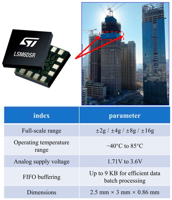 Traditional tethered sensing systems have been successfully applied to monitor the operation and extreme conditions of many civil engineering structures. Yet, their deployment is often complex and costly []. With the advancement of micro-electromechanical systems (MEMS) technology, the performance of MEMS accelerometers has improved significantly, featuring small size, low power consumption, low cost, and strong anti-interference and impact capabilities, making them suitable for the harsh environments of super high-rise building construction sites. In 1959, George W. Housner first used an accelerometer to monitor the vibrations of high-rise buildings, discussing in detail the importance of using accelerometers to monitor the dynamic behavior of buildings during earthquakes []. Researchers in the United States [,,] have proposed a new MEMS-based strong motion network for community participation in earthquake monitoring. Liang and others [] developed a MEMS-based Structural Health Monitoring (SHM) system and conducted a shake table test on a small three-story specimen. By comparing cost-effective MEMS accelerometers with high-cost, high-precision accelerometers based on the principle of force balance, experimental studies have shown that MEMS accelerometers are suitable for precise acceleration response measurements and structural frequency calculations under strong vibrations.