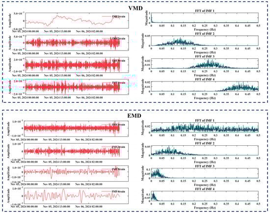 To verify the effectiveness of VMD, its decomposition results are compared with those obtained using EMD. As shown in Figure 6, EMD suffers from endpoint effects, leading to a certain degree of spectral overlap between different IMFs, whereas VMD effectively reduces mode mixing and enhances the extraction of features in different frequency bands.