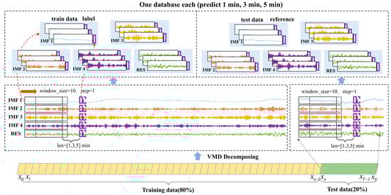 This study is based on a preprocessed vibration dataset spanning 48 h from 5 November 2024 to 6 November 2024, divided into training and testing sets in an 80% to 20% ratio to ensure effective training and validation of the model. Subsequently, the VMD method is applied to decompose the vibration signals of the training and testing sets, yielding four IMFs and one residual component. Sliding window techniques are then used to segment each modal component, with window lengths set at 10 min and step lengths at 1 min. Through the movement of the sliding windows, training and testing data for each modal component are constructed. The vibration values for the last 1 min, 3 min, and 5 min of each window are used as labels for the training and testing data, for training and validating the deep learning network prediction model. Figure 7 shows the vibration state prediction model database construction process.