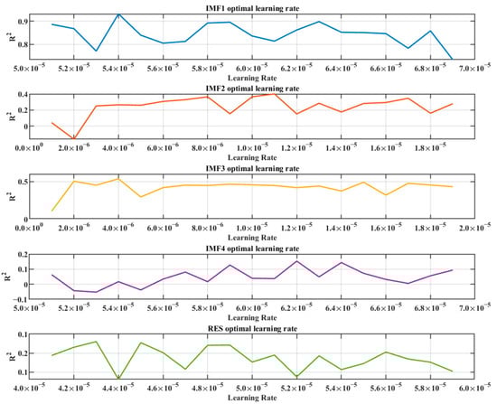 From the figure, it is evident that different learning rates are employed for different modal components to optimize the final prediction outcomes, with the optimal learning rates for IMF1–4 set, respectively, at 5.40 × 10−5, 1.10 × 10−5, 4.00 × 10−5, 6.20 × 10−5, and the optimal learning rate for the residual component at 4.30 × 10−5. Upon completion of training, the test dataset is input into the VMD-TCN model that has been trained, for validation. The results predicted by the model are then subjected to inverse normalization to restore the data to its original scale, facilitating the assessment and analysis of actual effects.