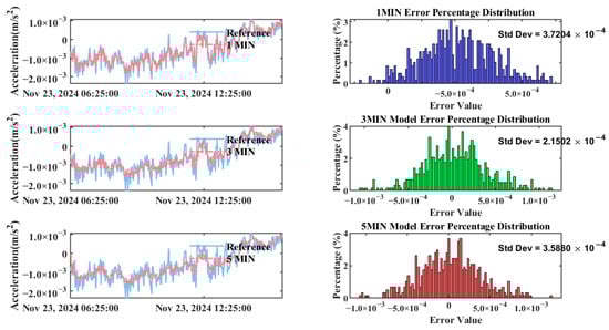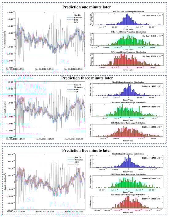 The figure indicates that predictions using sinusoidal wave fitting for the 1 min, 3 min, and 5 min acceleration time series are unable to ideally fit the acceleration trends and vibration scenarios. The deviation is primarily distributed between (−0.005, 0.005), which is significantly greater than the prediction deviation of GRU and TCN deep learning networks (−0.002, 0.002). The standard deviation of the sinusoidal wave fitting’s bias is significantly larger than that of the deep learning networks. The prediction capabilities of the TCN and GRU networks are comparable when applied to the raw, undecomposed signals.