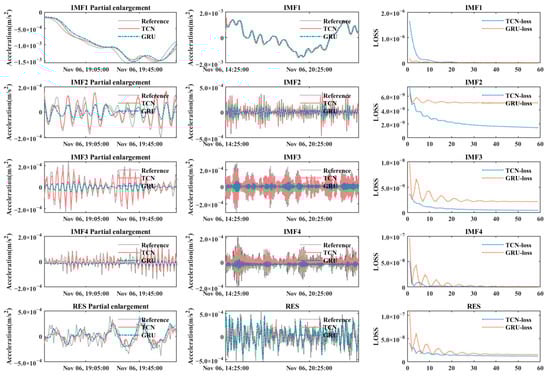 Direct predictions using undecomposed signals struggle to capture the nonlinear and complex variations in signals, resulting in TCN and GRU models not effectively predicting the scaffolding vibration, with both models’ R2 values not exceeding 80%. To address this, the original signals are decomposed into multiple IMFs using VMD, allowing for separate predictions of different frequency and time-scale features. The results and the training loss curve are shown in Figure 11.