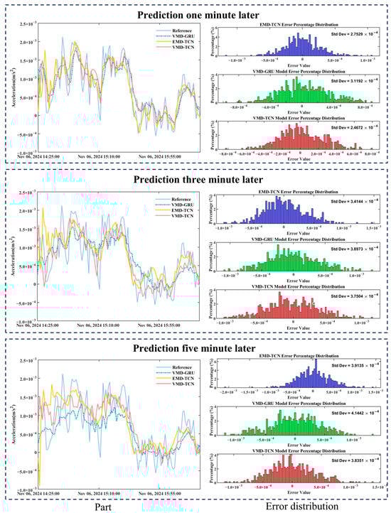 To further verify the stability of model prediction errors, this study calculates the prediction error distribution intervals for different models at a 95% confidence level, as shown in Table 3. It can be observed that VMD-TCN has the narrowest confidence interval, indicating the best prediction stability and the lowest error fluctuation. In contrast, VMD-GRU exhibits a wider error distribution interval, leading to less stable predictions, especially for long-term forecasts (3 min and 5 min), where error fluctuations are more pronounced.