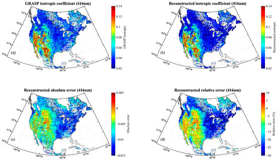 Similar to Figure 3 but presenting the isotropic coefficient results at 416 nm from the average monthly BRDF product for March 2020. (a) GRASP BRDF isotropic coefficient, (b) reconstructed isotropic coefficient, (c) reconstructed absolute error, (d) reconstructed relative error.