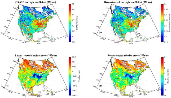 Similar to Figure 3 but depicting the isotropic coefficient results at 772 nm, based on the average monthly BRDF product in March 2020. (a) GRASP BRDF isotropic coefficient, (b) reconstructed isotropic coefficient, (c) reconstructed absolute error, (d) reconstructed relative error.