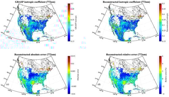 Similar to Figure 3 but showing the isotropic coefficient results at 772 nm, derived from the average monthly BRDF product for August 2020. (a) GRASP BRDF isotropic coefficient, (b) reconstructed isotropic coefficient, (c) reconstructed absolute error, (d) reconstructed relative error.