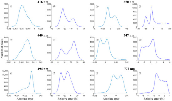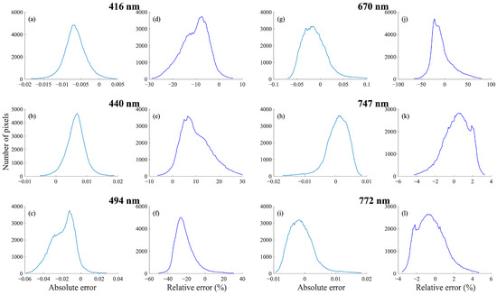 Similar to Figure 7 but for the BRDF isotropic coefficient data from March 2020. (a–c,g–i) reconstructed absolute error, (d–f,j–l) reconstructed relative error from 416 nm to 772 nm.
