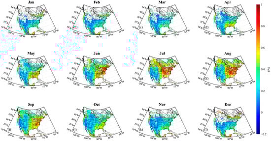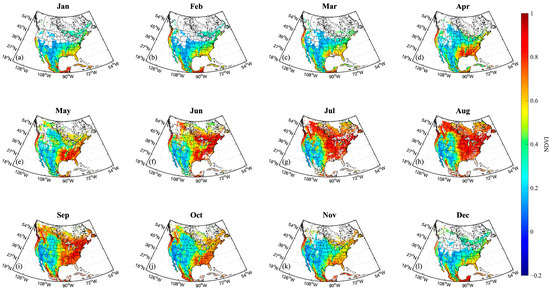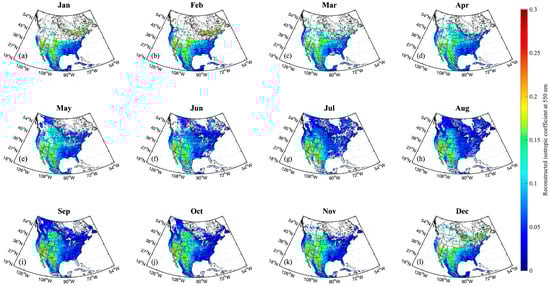 The reconstructed spatial distribution at 550 nm effectively reflects seasonal changes in isotropic coefficients across North America. Given that reflectance in the visible spectrum typically decreases as chlorophyll content increases [], lower isotropic coefficients are observed during summer months (e.g., July–September) in vegetated areas, corresponding to decreased reflectance from active vegetation. Conversely, higher coefficients are seen in winter months (e.g., December–March), corresponding to reduced vegetation activity and potential snow cover. To further investigate spectral characteristics, six valid locations with consistent monthly data throughout the year are randomly selected for detailed analysis. This ensures representative results across varying seasons, highlighting the robustness of the reconstruction method.