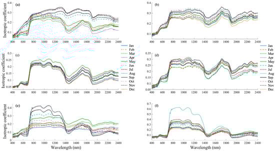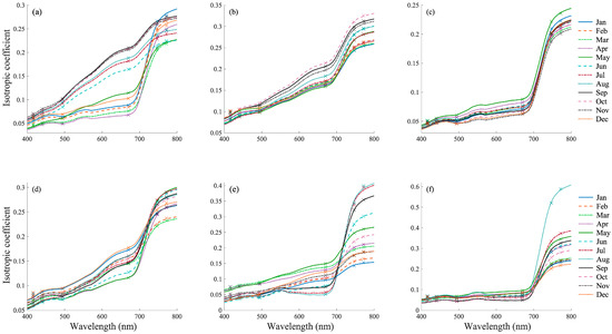 Figure 10 illustrates the monthly spectral variations of the isotropic coefficient as a function of wavelength (400–800 nm) for six selected locations along 35.48°N, ranging from west to east. Panels (a) through (f) provide insights into monthly and seasonal variations across three key spectral regions: 550 nm (green band), 670 nm (red band), and the red-edge region (670–760 nm). These regions are critical for understanding vegetation dynamics.