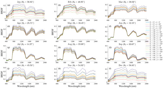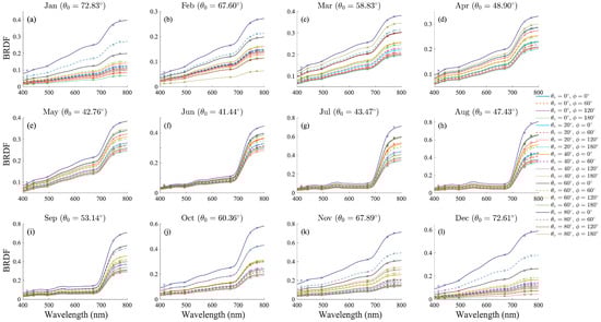 Spectral variations of reconstructed BRDF for different observation geometries obtained, combining five viewing zenith angles ( = 0°, 20°, 40°, 60°, and 80°) and four relative azimuth angles ( = 0°, 60°, 120°, and 180°) at the selected location (90.88°W, 35.48°N). The analysis assumes a 9:00 AM local time on the 15th of each month from January to December. The solar zenith angle () is precalculated based on the date, time, and geographic coordinates. Different colors indicate varying observation geometries. Solid line represents the BRDF results calculated using Equation (17), incorporating wavelength-independent normalized coefficients (, ) of the geometric-optical and volumetric surface scattering kernels, along with the wavelength-dependent isotropic coefficients derived from surface reflectance reconstruction. The cross symbols represent the calculated BRDF results at six wavelength bands, obtained using the corresponding coefficients from the GRASP BRDF product. Monthly variations: (a) January, (b) February, (c) March, (d) April, (e) May, (f) June, (g) July, (h) August, (i) September, (j) October, (k) November, (l) December.