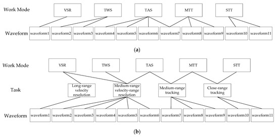 Based on the prepared waveform parameters, radar work mode data simulation is conducted under two MFR signal models, respectively. Signal model 1 establishes a one-to-multiple mapping relationship between work mode and waveform, as shown in