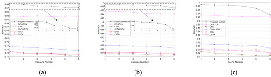 Figure 6 shows the recognition results of the signal model 1 dataset under three test scenarios. At a lower pulse loss level, there is a decreasing trend in the accuracy of these methods as the measurement error worsens, but they all can still maintain more than 97% of the category discrimination. Pulse loss can disrupt the temporal distribution of the original PRI parameter sequence with parameter range overlap and complex modulation, while the PW, RF, and PA parameter still have recognition separability within their respective ranges, resulting in a recognition accuracy above 94%. In the complex scenarios with measurement error and pulse loss, the accuracy shows a more obvious downward trend. However, due to the multi-dimensional features expanding separability space and the deep network model extracting effective features from noisy data, the proposed method and various baseline methods can both maintain high recognition accuracy more than 90%. The overall observation results show that under signal model 1, the proposed method is generally superior to the baseline methods. Although it did not show very an outstanding recognition accuracy, this result verifies that our method has competitive recognition performance under the condition of having a simple mapping structure. The superiority of our method is mainly manifested in the recognition under complex waveform mapping models.