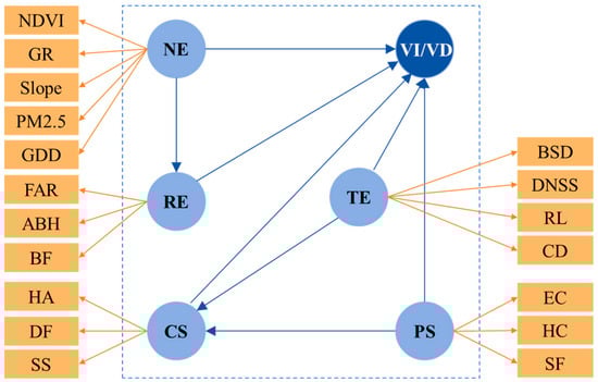 Among the above variables, VI, VD, CS, PS, TE, RE, and NE cannot be directly obtained and need to be assessed using other measurable data. In structural equation modeling, unmeasurable variables are represented as latent variables, which are indicated by a set of observed variables that can be directly observed or measured []. The relationship between latent and observed variables follows a formative measurement model (FMM), meaning the meaning of latent variables is determined by the manifest variables, with manifest variables forming or causing latent variables. Table 2 provides detailed descriptions and data sources for all latent and observed variables.