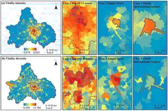 Spatial distribution of VI and VD scores: ➀ case 1; ➁ case 2; ➂ case 3. (a) Vitality intensity; (b) vitality diversity. Case 1: Top 30 communities with the highest VI/VD scores within the Third Ring Road. Case 2: Xingfu Street in Dujiangyan City. Case 3: Chengdu Tianfu International Airport.