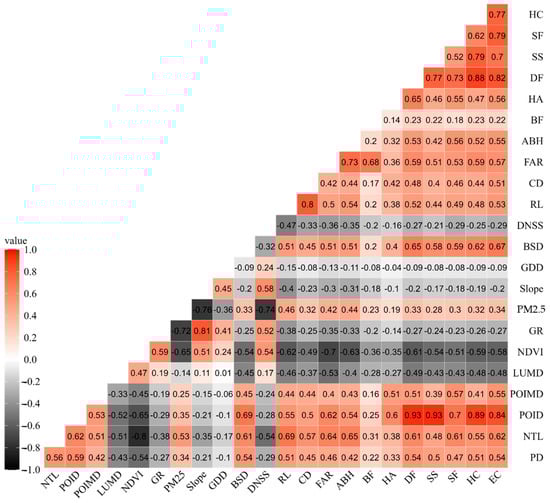 The distance to subway stations (DNSS), NDVI, slope, greening rate (GR), disaster point density (GDD), and LUMD are negatively correlated with other observed variables, suggesting a negative relationship with both urban vitality intensity and vitality diversity. Among these, GDD shows a relatively low correlation with other positively correlated variables, with correlations below 0.15 for all variables except PM2.5.